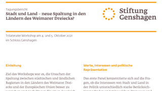4. Oktober 2021, 00:00 - 5. Oktober 2021, 00:00Am 4. und 5. Oktober 2021 fand im Schloss Genshagen der trilaterale Workshop „Stadt und Land – neue Spaltung in den Ländern des Weimarer Dreiecks?“ mit ca. 30 deutschen, französischen und polnischen Vertreterinnen und Vertretern aus Wissenschaft und Politik statt.
