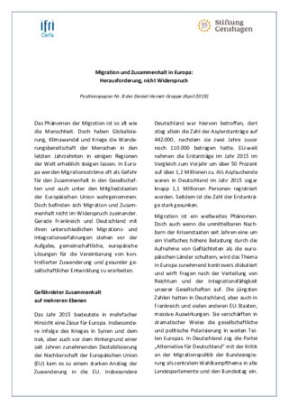 La huitième prise de position du groupe Daniel-Vernet porte sur l’immigration, l’intégration et la cohésion en Europe. La migration est souvent perçue en Europe comme une menace pour la cohésion au sein des sociétés, mais aussi entre les États. Dans sa prise de position, le groupe Daniel Vernet estime que migration et cohésion ne sont pas contradictoires. Néanmoins, l'Allemagne et la France en particulier doivent faire un effort pour développer des approches constructives et des réponses européennes à ce défi.