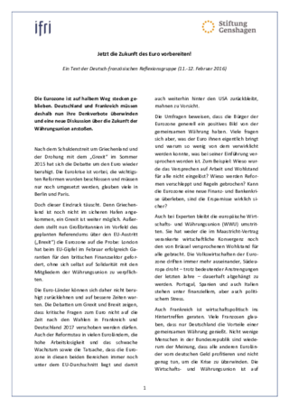 Mit dem 3. Positionspapier "Jetzt die Zukunft des Euro vorbereiten!" zeigt die Deutsch-französische Reflexionsgruppe, dass die Eurozone auf halbem Weg stecken geblieben ist. Deutschland und Frankreich müssen deshalb nun ihre Denkverbote überwinden und eine neue Diskussion über die Zukunft der Währungsunion anstoßen.