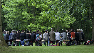 27 mai 2016L’Académie sous les arbres de la Fondation Genshagen proposa le vendredi 27 mai 2016 une réflexion sur ce que l’art a le droit de faire, si on peut lui imposer des limites, et si oui, qui doit les déterminer. Sous les arbres du parc du Château de Genshagen, citoyens, acteurs culturels et scientifiques de différents pays européens et d’autres parties du monde, partagèrent de façon saisissante leurs expériences sur les conflits entre liberté de l’art et liberté religieuse. En partant de perspectives culturelles et de points de vue très différents, les participants se demandèrent si ce que l’art peut faire correspond également à ce que l’art devrait faire. Des productions artistiques ayant fait l’objet de fortes critiques médiatiques et sociales furent abordées au cours des discussions. L’exposition des œuvres du photographe français Olivier Ciappa, par exemple, provoqua et enthousiasma tout autant le public : Ciappa avait pris part au débat sur le mariage pour tous en photographiant des couples imaginaires homosexuels ; des personnalités françaises avaient été mis en scène pour ces photographies. L’Association Zuflucht Kultur donna une autre impulsion artistique, des membres de la chorale syrienne pour la paix présentèrent une performance saisissante, tant musicale que poétique, que le public salua d’une ovation enthousiaste. Le débat sous les arbres porta notamment sur les violentes réactions de groupes religieux à la pièce de théâtre Golgota Picnic de Rodrigo García, lors de sa programmation au festival Malta de Poznań (Pologne), ainsi que sur d’autres exemples artistiques européens.