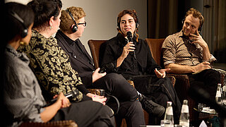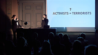 Le collectif Le Bruit Qui Court a ouvert la soirée avec la première d’une performance. Il expérimente des formes de résistance créatives et collectives afin de promouvoir la justice sociale et écologique, créant ainsi des espaces de résonance pour les débats sociaux. Le journaliste Jean Peters a ensuite animé une table ronde interdisciplinaire avec la spécialiste en sciences culturelles Ewa Majewska, la conservatrice Mahret Kupka, l’artiviste Clara Thuelin et l’écrivaine Manja Präkels. Les panélistes ont débattu des moyens et de l’impact de l’activisme artistique pour influencer les débats publics.
