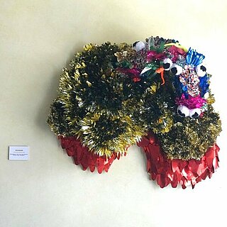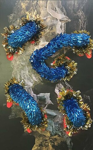 Les œuvres exposées au château de Genshagen font partie de la série d’expositions « La Vie Liquide », sur ce monde où tout s’écoule. Dans cette exposition, l’artiste se rapporte à la thèse du sociologue et philosophe polono-anglais Zygmunt Bauman selon laquelle on assisterait à une transition sociale historique passant d’une modernité stable fondée sur des produits matériels, à une modernité fluide, basée sur des logiciels. Cécile Wesolowski réagit à ces nouveaux courants dans les modes de vie en procédant à une recomposition exagérée et selon sa propre perspective des phénomènes liés à cet anthropocène fluide et numérique qu’elle remet ainsi en question. Des couvertures de survie dorées se trouvent transformées au cours d’un fastidieux travail manuel en décor floral ; du métal plié et associé à des jeux de lumière immatériels déconstruit des contradictions, banales en apparence, de la société de consommation. Avec beaucoup d’imagination et d’humour, des objets de consommation, jusqu’alors profanes, sont mis en scène pour suggérer désormais l’éclat, le glamour et la valeur. Par cette fusion, ce qui n’était encore que simple objet devient alors porteur du symbole d’un rapport distendu entre l’Homme et la Nature, mais se mue en même temps en autant de nouvelles créatures dans un paysage artistique.[1]