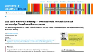 La troisième Conférence mondiale de l’UNESCO sur l’éducation culturelle et artistique, qui a eu lieu en 2024 à Abou Dabi, a adopté un cadre qui aborde des questions relatives à l’équité mondiale, la durabilité, la démocratisation et les valeurs dans le contexte de l’éducation artistique et culturelle. Susanne Keuchel, membre de la délégation allemande à Abou Dabi, présente dans un article publié sur la plateforme en ligne KuBi-Online les aspects les plus importants de ce cadre et les met en relation avec les débats nationaux actuels afin de dégager les processus de transformation nécessaires dans le domaine de l’éducation culturelle et artistique en Allemagne. À partir de là, elle tente d’apporter quelques réponses à la question suivante : où va l’éducation culturelle ? L’article (en allemand) peut être téléchargé ici dans son intégralité.