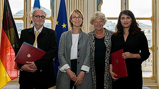Michel Jullien, Françoise Nyssen, Monika Grütters und Fatma Aydemir bei der Preisverleihung in Paris. Foto: © Didier Plowy