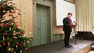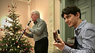 10 grudnia 2019 - 1 stycznia 1970W dniu 10 grudnia 2019 r. w Pałacu Genshagen ponownie odbył się Międzypokoleniowy Salon Muzyczny. Każdego roku w okresie adwentu i Bożego Narodzenia, emeryci, dzieci i rodziny z regionu spotykają się w Genshagen, aby zapoznać się z muzyką z różnych kręgów kulturowych. Oprócz powitań ze strony burmistrza Ludwigsfelde, Andreasa Igela oraz sołtysa Genshagen, Dirka Houschki, w tym roku w programie znalazł się również występ dzieci z przedszkola z Genshagen. W duchu dialogu międzyreligijnego motto brzmiało: „Happy Weihnukkah!” Zaprezentowano muzykę zaczerpniętą z chrześcijańskiej tradycji Świąt Bożego Narodzenia i żydowskiej tradycji Święta Poświęcenia Chanuka, gdyż obie uroczystości zbiegają się w 2019 roku. Na początku duet śpiewający „Jenny Wojtyczka & Philipp Altmann” animował gości z Genshagen i okolic do wspólnego śpiewania kolęd. Po krótkim wprowadzeniu na temat znaczenia święta Chanuka, muzycznym punktem kulminacyjnym programu był występ klezmerskiego zespołu „Harry's Freilach” z Harrym Timmermannem na klarnecie i Nikosem Tsiachrisem na gitarze. Na zakończenie pastor Michael Bolz czytał bożonarodzeniowe historie.