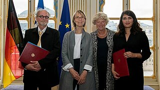 Michel Jullien, Françoise Nyssen, Monika Grütters und Fatma Aydemir bei der Preisverleihung in Paris. Foto: © Didier Plowy