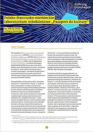 W niniejszym katalogu propozycji uczestnicy laboratorium młodzieżowego podsumowali swoje zalecenia odnośnie dalszego rozwoju „Paszportu do kultury“. W swojej analizie zidentyfikowali podobieństwa i różnice między istniejącymi modelami w Niemczech i Francji. Rezultatem ich analizy są praktyczne propozycje dalszego rozwijania istniejących modeli i wspierania tworzenia podobnego narzędzia w Polsce. Proponowane przez nich rozwiązania mają na celu zapewnienie dostępu do kultury wszystkim młodym ludziom, wzmocnienie ich partycypacji i stworzenie nowych możliwości wymiany poprzez kulturę.