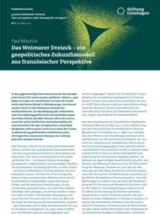 In der gegenwärtigen Situation braucht die Europäische Union (EU) einen neuen, größeren »Motor«, und dabei ist Polen ein natürlicher Partner für Frankreich und Deutschland in Mitteleuropa. Aus französischer Sicht ist das Weimarer Dreieck ein Schlüsselformat zur Bewältigung der sicherheits und verteidigungspolitischen Herausforderungen nach dem Brexit; darüber hinaus soll es als Instrument