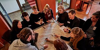Ergänzend dazu wurde als Abschluss der Veranstaltung in drei Gruppen das Ziel verfolgt, praxisorientierte Lösungsstrategien hinsichtlich der Handlungsfelder „Beratung von Kunst- und Kulturinstitutionen sowie Akteurinnen und Akteuren“, „Partnerschaften zwischen etablierten Kulturinstitutionen und dezentralen Kunstorten“ sowie „Nachwuchsförderung“ zu entwickeln.