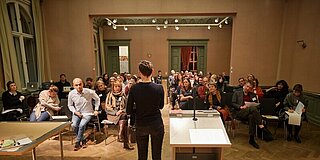 Als künstlerischer Ausklang des ersten Tages konnten die Teilnehmenden das Hörspiel Broken German (Produktion des SWR, nach dem gleichnamigen Roman von Tomer Gardi) von Noam Brusilovsky erleben und mit dem Regisseur ins Gespräch kommen.