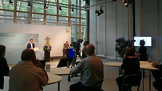 Die Diskussionsrunde fand in Form einer hybriden Veranstaltung in der Landesvertretung Nordrhein-Westfalen in Berlin statt und wurde gleichzeitig digital via Zoom und YouTube übertragen. Neben den 40 Gästen vor Ort verfolgten über 70 Teilnehmende die Veranstaltung digital.