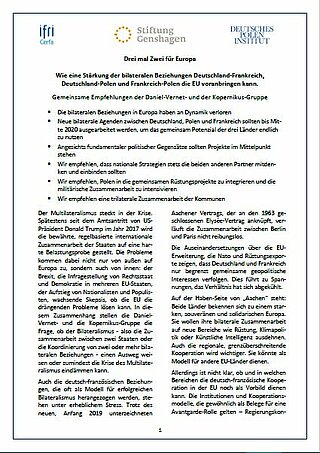 14. November - 15. November 2019Die IX. Sitzung der Daniel-Vernet-Gruppe fand am 14. und 15. November in Kooperation mit der deutsch-polnischen Kopernikus-Gruppe statt und widmete sich der Frage, welche Rolle die bilateralen Beziehungen zwischen Deutschland und Frankreich, Deutschland und Polen sowie Frankreich und Polen für die Europäische Union spielen. Als externe Experten waren Stefan Bantle, Referatsleiter E24 (Frankreich, Niederlande, Belgien, Luxemburg, Monaco) und Martin Kremer, Referatsleiter E22 (Polen, Tschechien, Österreich, Slowakei, Ungarn, Slowenien, Kroatien; Weimarer Dreieck und Visegrád-Zusammenarbeit), aus dem Auswärtigen Amt eingeladen.