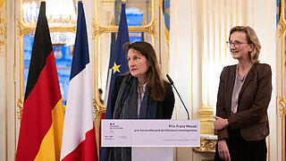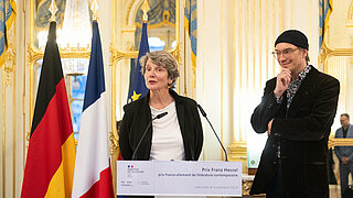 8. November 2023 - 1. Januar 1970Kulturstaatsministerin Claudia Roth und die französische Kulturministerin Rima Abdul Malak haben am 8. November 2023 den deutsch-französischen Franz-Hessel-Preis für zeitgenössische Literatur im französischen Kulturministerium in Paris verliehen. Sie zeichneten die beiden Autor*innen Fridolin Schley (Die Verteidigung, Hanser Berlin) und Maryline Desbiolles (Charbons ardents, Seuil) aus. Staatsministerin Roth hob in ihrer Rede hervor, dass Literatur keinen Krieg beenden und keinen Mord widerrufen könne, „aber sie kann Einspruch einlegen, Lebenszeichen setzen, im Namen der Humanität.“