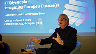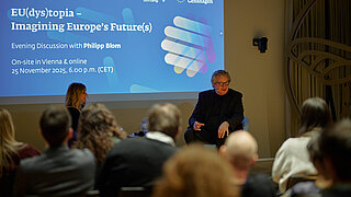 Diesen Fragen ging die Abenddiskussion mit dem renommierten Historiker und Autor Philipp Blom nach. Umrahmt wurde sie von kurzen Beiträgen der Künstler*innen und Forscher*innen aus dem transdisziplinären Projekt EU(dys)topia – Imagining Europe’s Future(s), die in Form von Gedichten, visueller Kunst und Gedankenexperimenten ihre Vorstellungen und Ideen zur Zukunft Europas und der europäischen Integration präsentierten.
